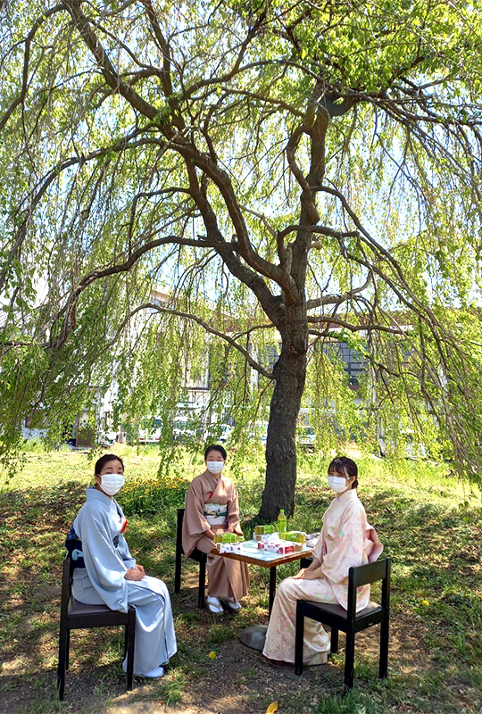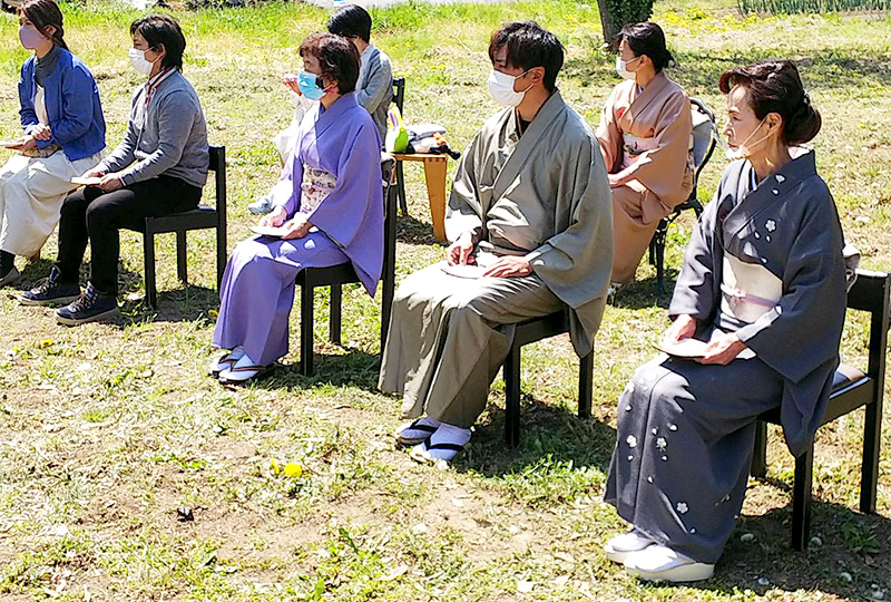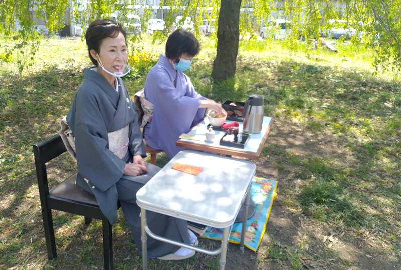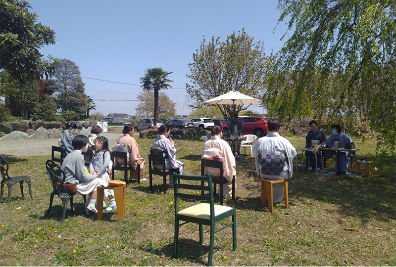 コロナ禍の2021年4月に生徒さんの自宅とお庭をお借りして野点の会を開催しました。少人数でソーシャルディスタンスを保ちながら行いました。お食事は花見弁当です。